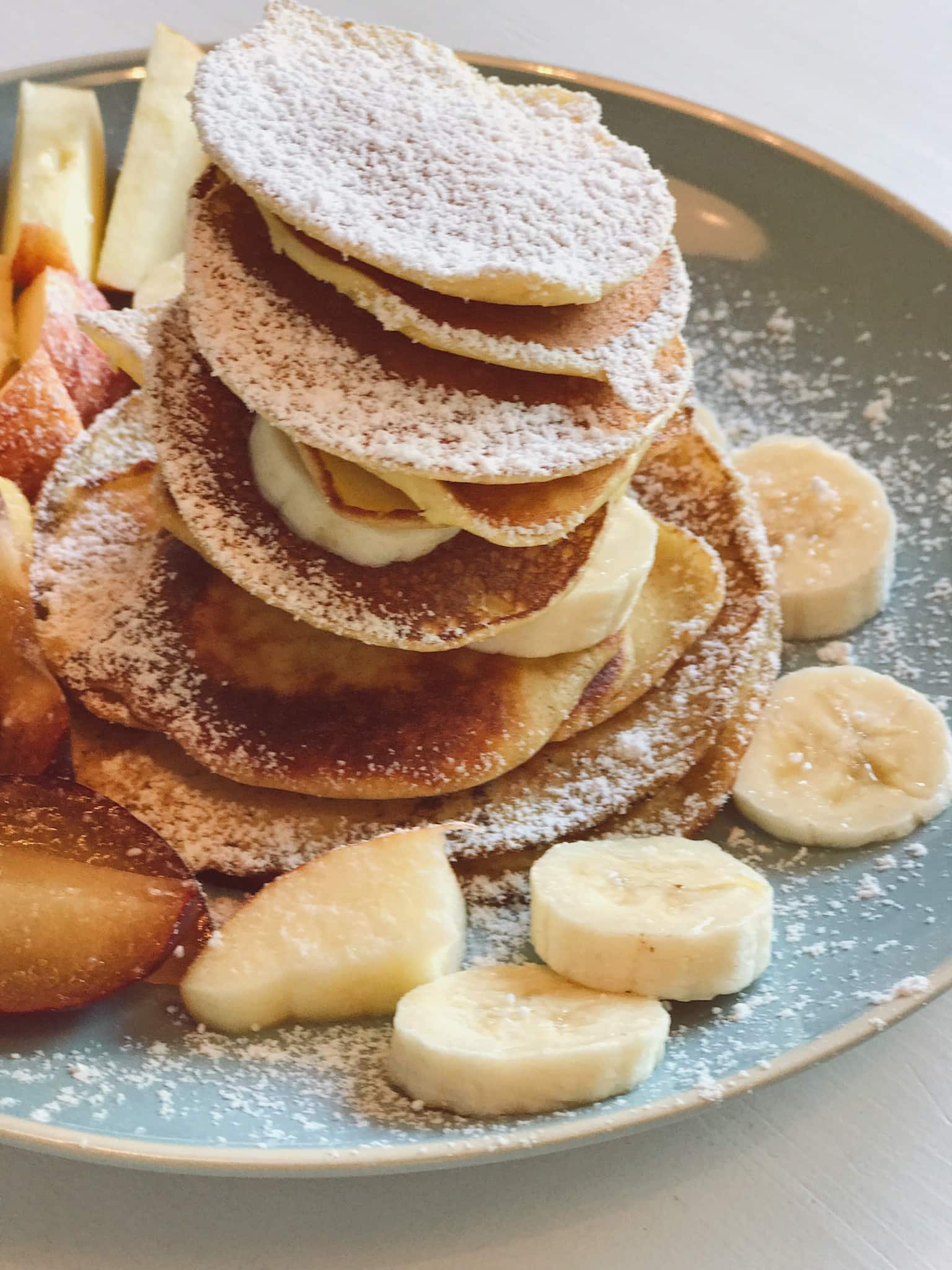 Für die Kids habe ich frisches Obst wie Pflaumen, Bananen und Heidelbeeren darüber gestreut. Und eine Extraportion Puderxucker gab es für jedes Kind obendrauf.