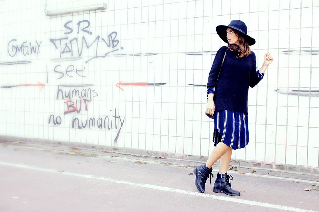 Ich hab mich sofort in den schwarzen, kuscheligen Turtleneck Pullover von Selected (gibt´s bei aboutyou.de) verliebt. Er kam letzte Woche mit ner ordentlichen Lieferung Herbstware in meinem Goldig Laden an. Zusammen mit dem nachtblauen oversize Hemdkleid von Mbym – das musste ich dann (is ja klar) auch sofort haben. Der Hut macht den Look komplett, denn Hut tut gut! Ausserdem übersteht man unter ihm auch gleich den ein- oder anderen Regenschauer.