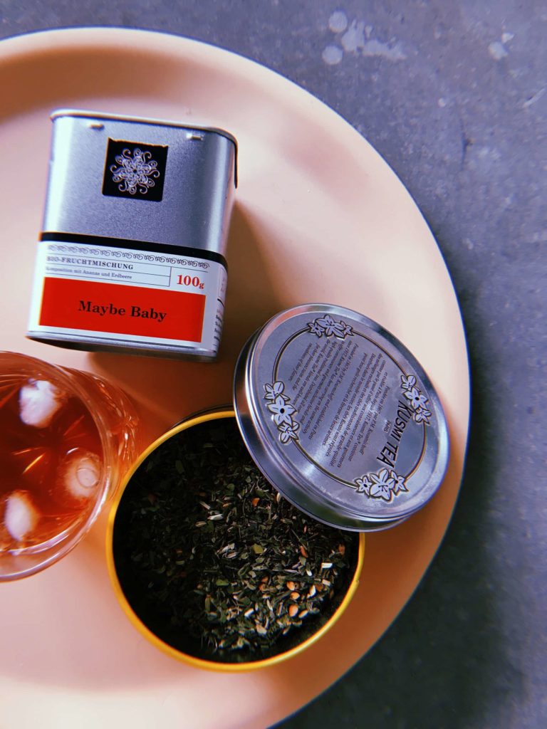 Dazu habe ich „Maybe Baby“ von SAMOVA gemischt, einem roten Früchtetee aus Hibiskusblüten, Süßholzwurzel und Erdbeerstücken. Ich mag Früchtetee eigentlich nicht besonders gern, weil er oft sauer schmeckt, aber dieser lose Tee ist wahnsinnig lecker.
