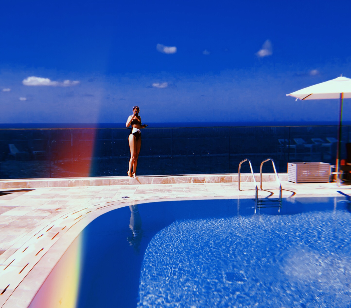 Der Hunger treibt uns einige Zeit später auf die Terrasse der Sa Talaia Pool Bar. Dort gibt es tagsüber durchgehend kleine Speisen, Getränke und Snacks. Nach einem Salat und einem Glas Vino geht es ab ins kühle Nass! Wir haben den Pool fast für uns alleine, Arschbombenkontest hiermit eröffnet…