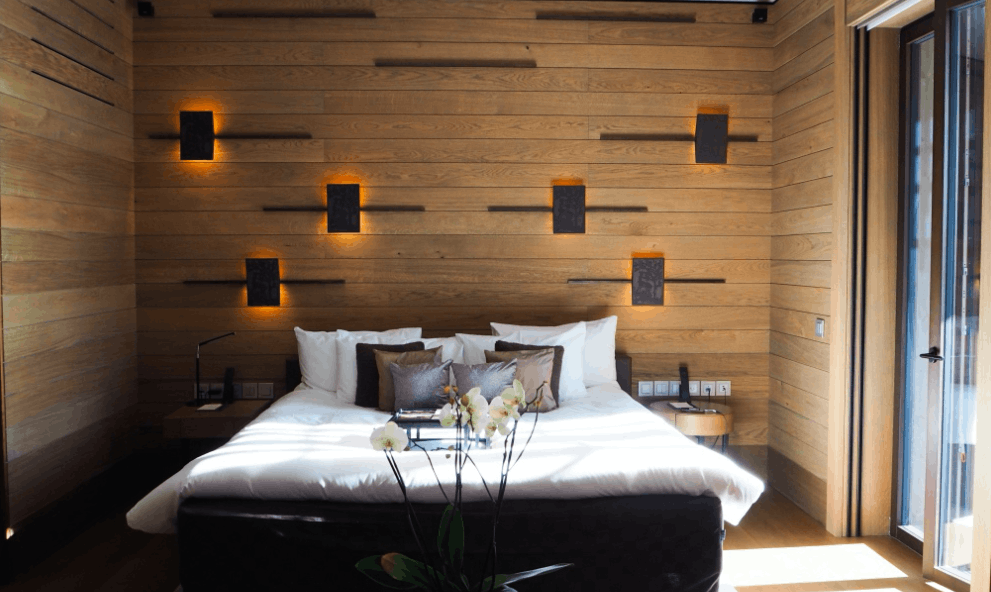 Kurze Zeit später betreten wir unser lichtdurchflutetes Zimmer und auch hier erwartet uns ein verglaster Kamin, den man sowohl vom Zimmer, als auch von der Terrasse aus sehen kann. Böden aus dunklem Alpenholz, weiche Ledersessel und -sofas, Panoramafenster und Kamine sind in jedem der insgesamt 123 Zimmer und Suiten zu finden und geben diesen eine unglaublich gemütliche Atmosphäre.