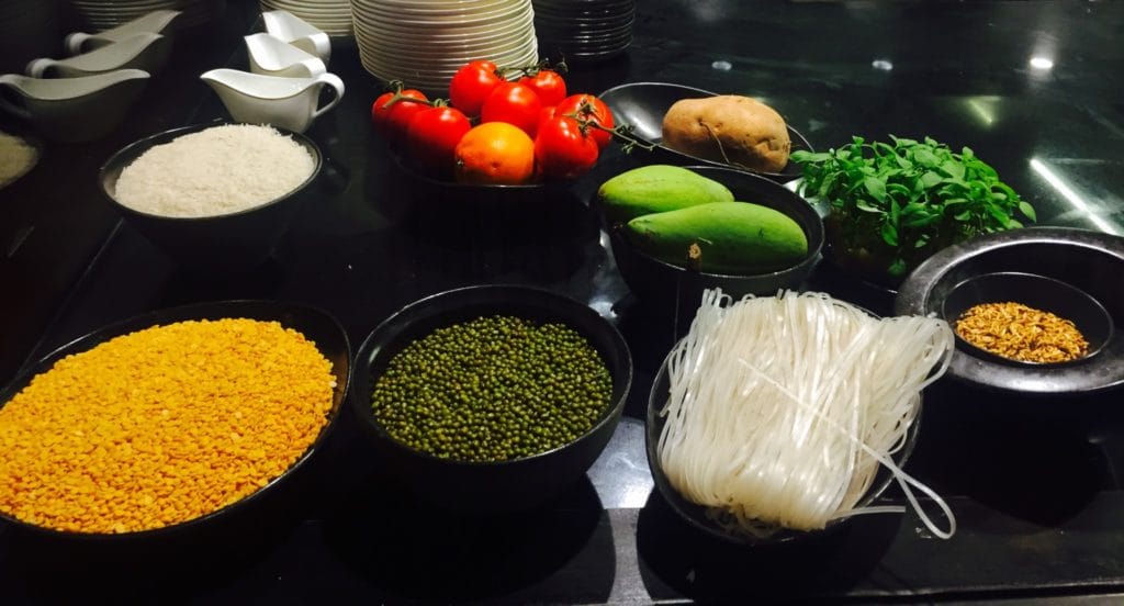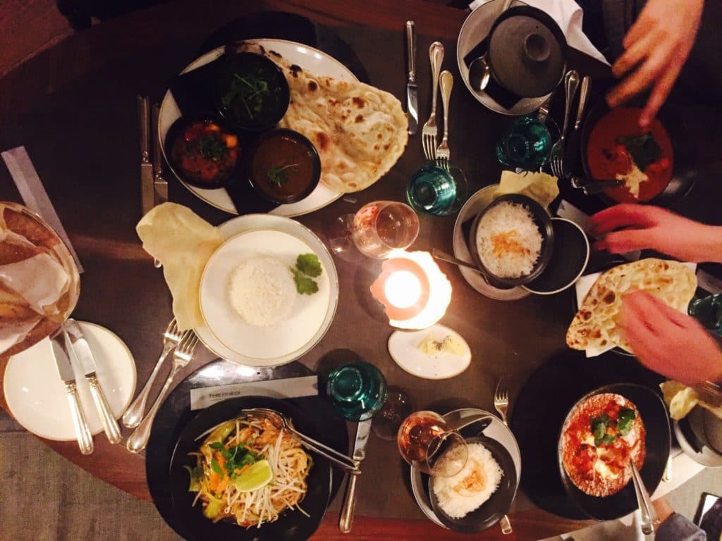 Asiatische, indische und europäische Küche auf einem Tisch im „The Restaurant“