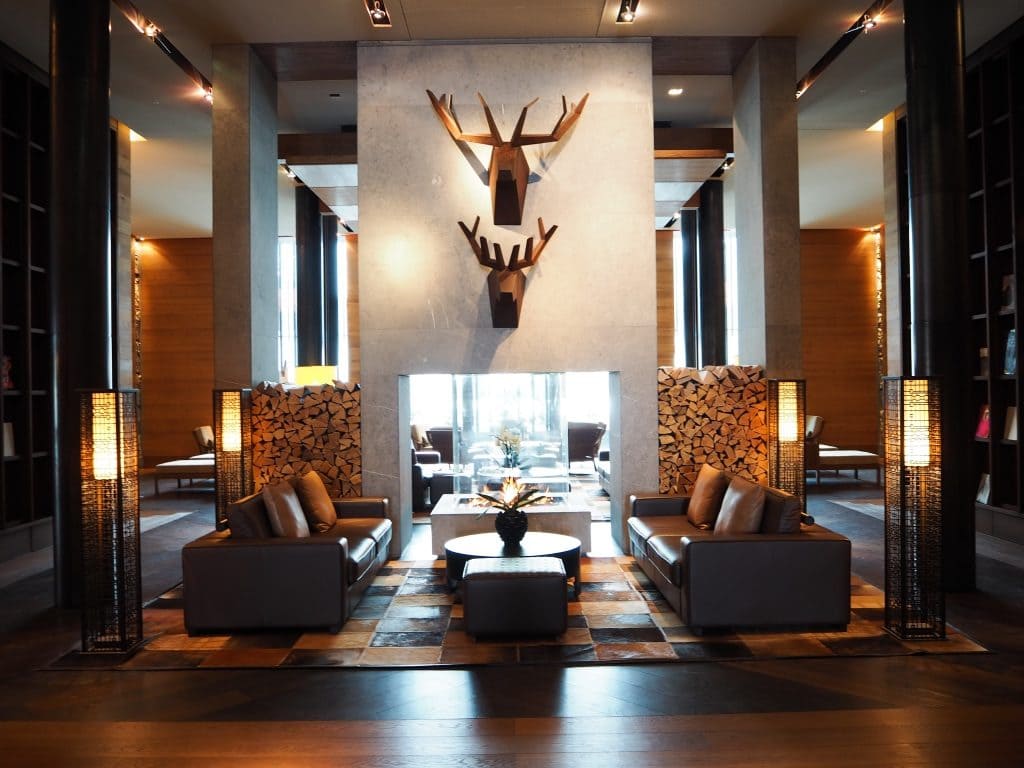 Als wir im Hotel ankommen fühlt es sich in der Sonne an wie Frühling. Auf den Bergen glitzert der Schnee und im Tal ist es sonnig und wunderschön warm, während es bei unserer Abreise in Hamburg noch bitterkalt war. Im Eingangsbereich prasselt ein Feuer im Kamin und die riesigen, gemütlichen Ledersofas und Sessel laden zum Verweilen ein.