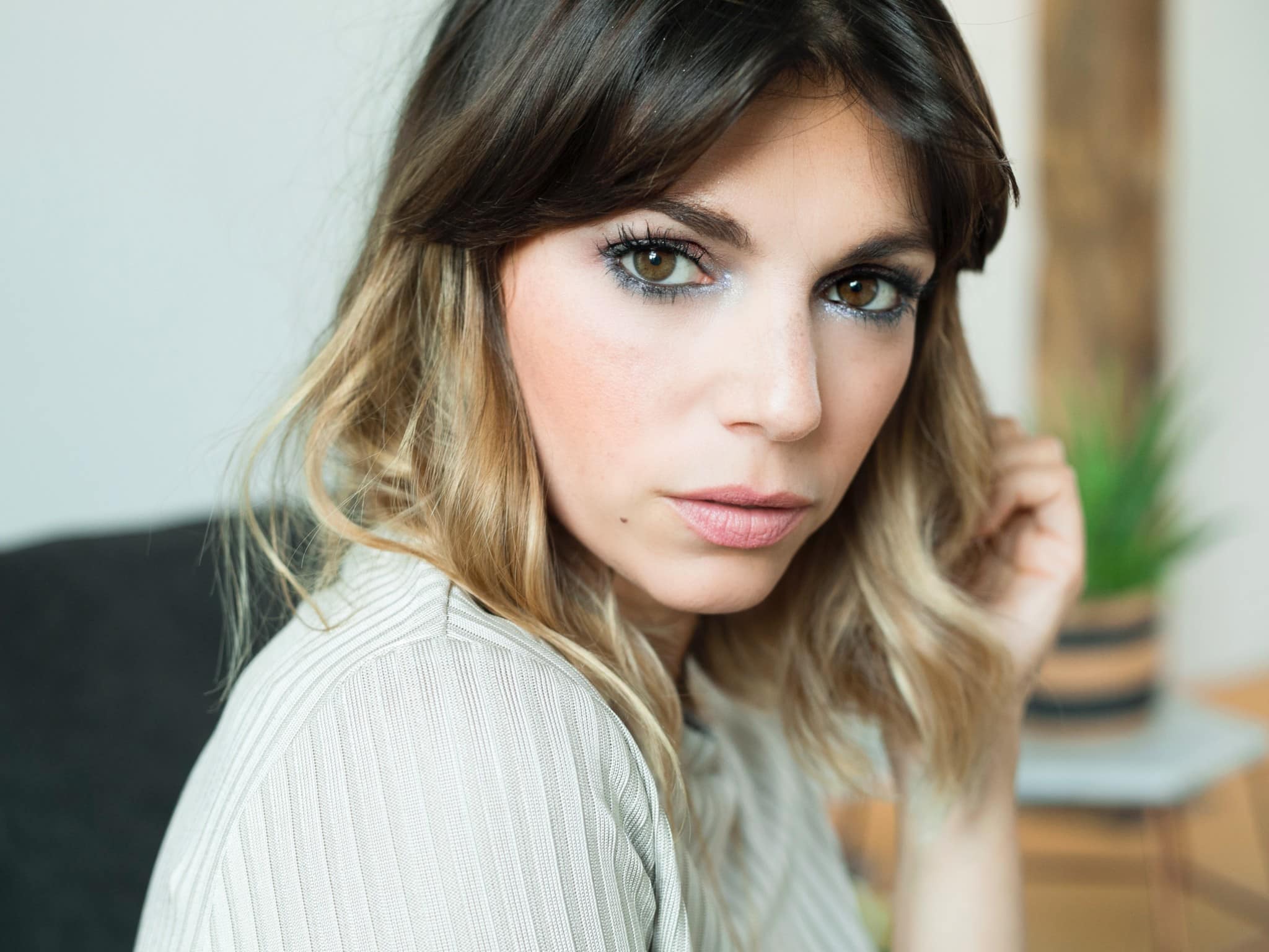 Bei den Lippen, sowie dem Rouge etwas zurückhalten, damit der Fokus auf den Augen liegt.